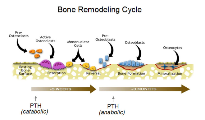 El hueso es una estructura dinámica, el cual alcanza su pico de masa óptimo entre finales de la adolescencia y la adultez temprana. Luego de esto, se somete a un proceso continuo de renovación llamado ciclo de remodelación ósea. Este proceso no ocurre solo de manera secuencial, sino también de una manera balanceada con el fin de mantener una densidad mineral ósea constante y sana. Esta función homeostática es controlada por citoquinas que actúan de manera local y procesos hormonales que actúan de manera sistémica. Disturbios en el balance del ciclo de remodelación ósea, son la causa de osteopenia y osteoporosis.